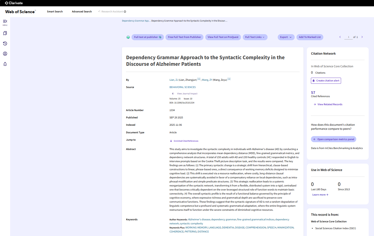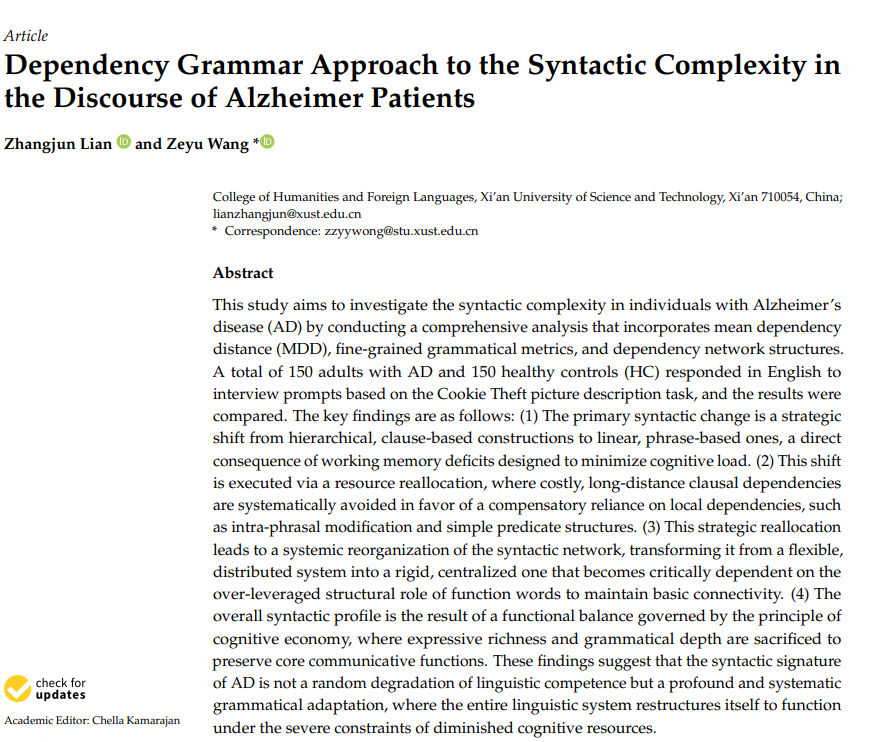 近日,m88APP官网副教授廉张军博士与2023级硕士研究生王泽宇合作完成的研究论文“Dependency Grammar Approach to the Syntactic Complexity in the Discourse of Alzheimer Patients”在SSCI索引期刊Behavioral Sciences发表。