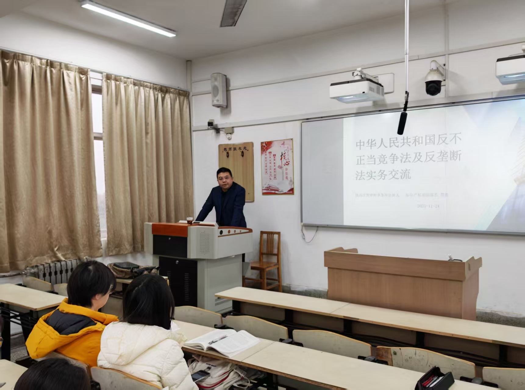 在交流互动环节,同学们热情高涨,围绕课程学习、法律实务难点以及行业发展前景等问题积极提问。贺鑫律师耐心细致地解答了同学们关于商业秘密认定、虚假宣传界定等专业疑问,深入分析了当下律师行业对法学专业人才的能力需求,并结合自身执业经历,从专业知识积累、实务技能提升、职业规划制定等方面,为同学们提供了切实可行的学习与就业建议。