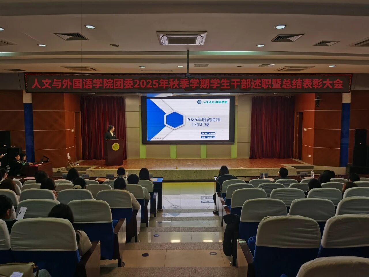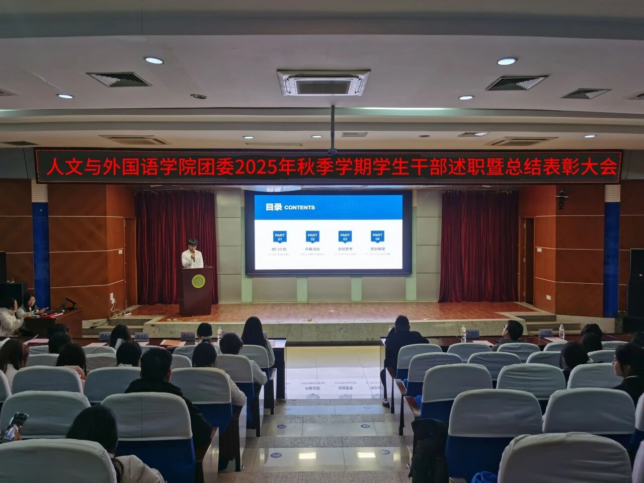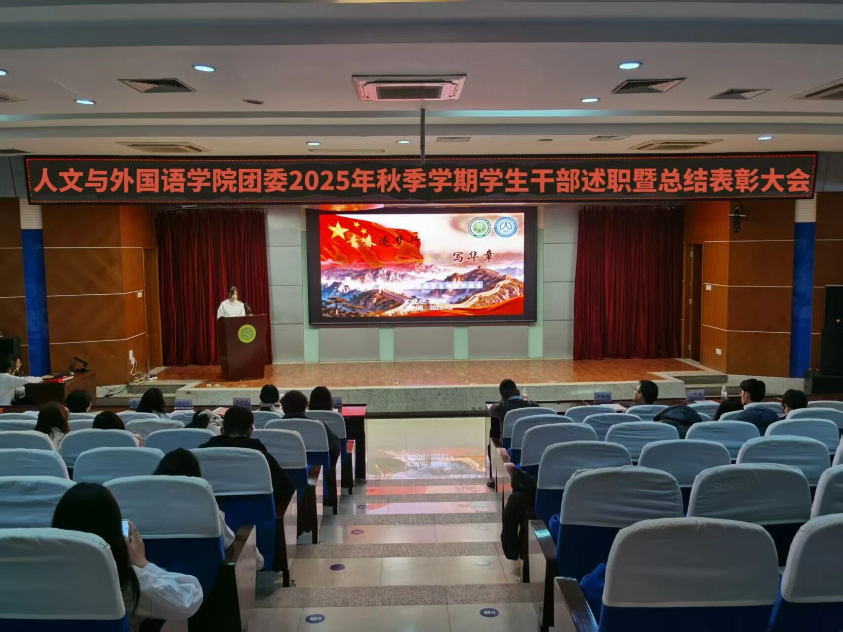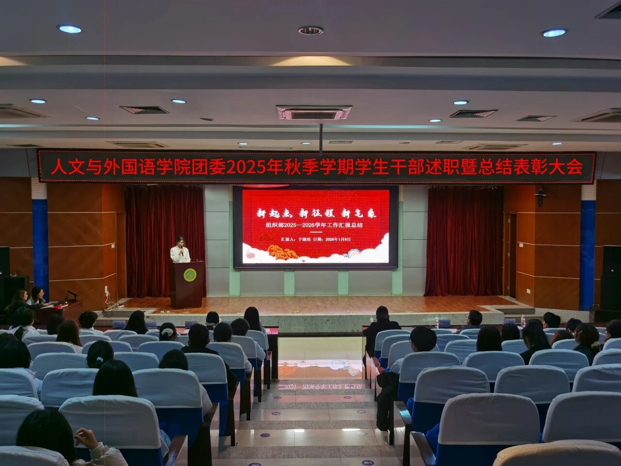 为进一步锚定工作方向,总结工作经验,切实提升学生干部工作能力与水平,1月8日晚,m88APP官网团委在骊山校园图书馆二楼报告厅举办2025年秋季学期学生干部述职暨总结表彰大会,学院团委书记芮智刚,辅导员李银亮、王维蒙,各团支部干部、团委学生会全体学生干部参加了会议,学生会副主席李泳泽主持会议。