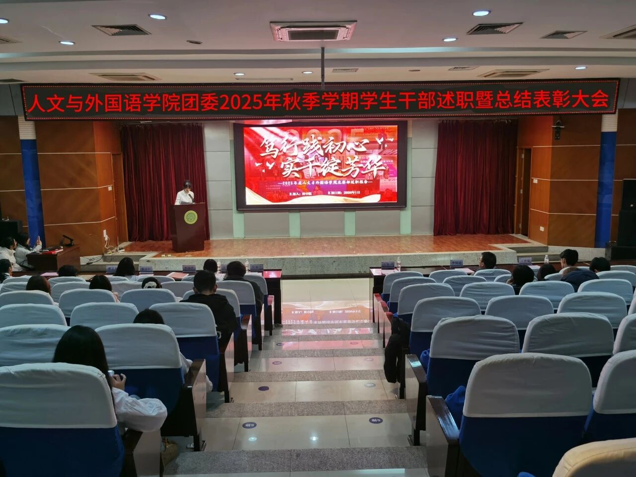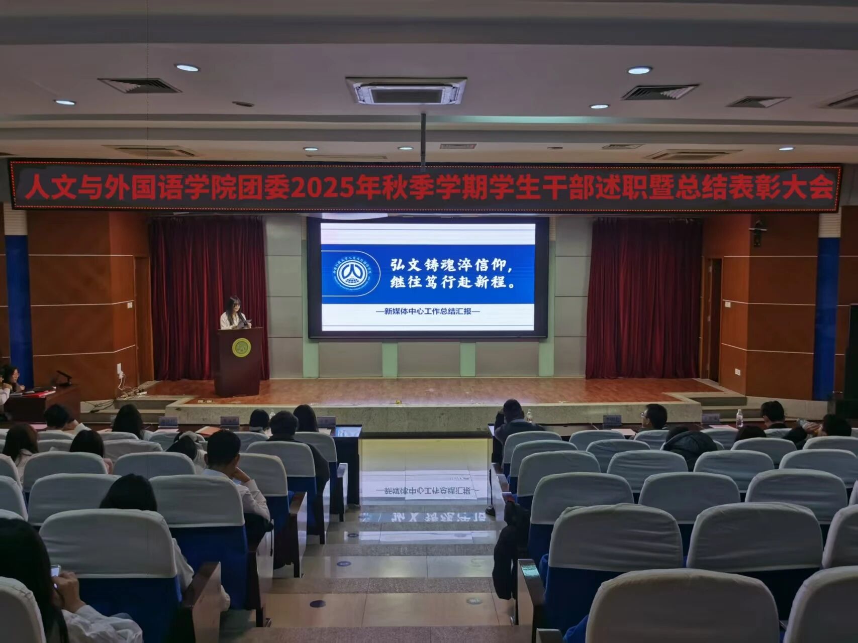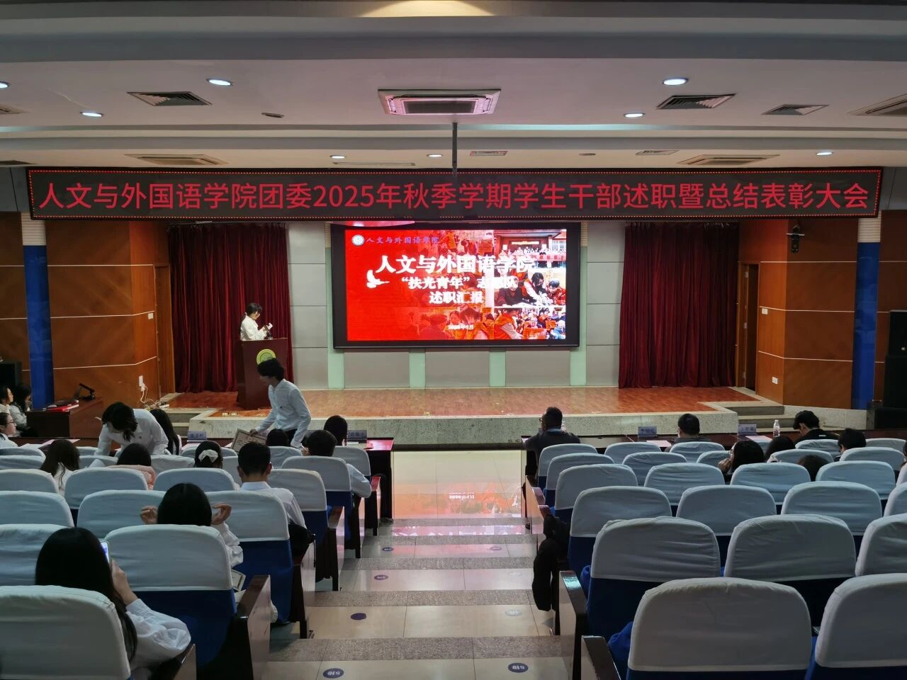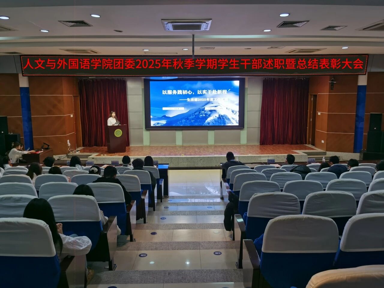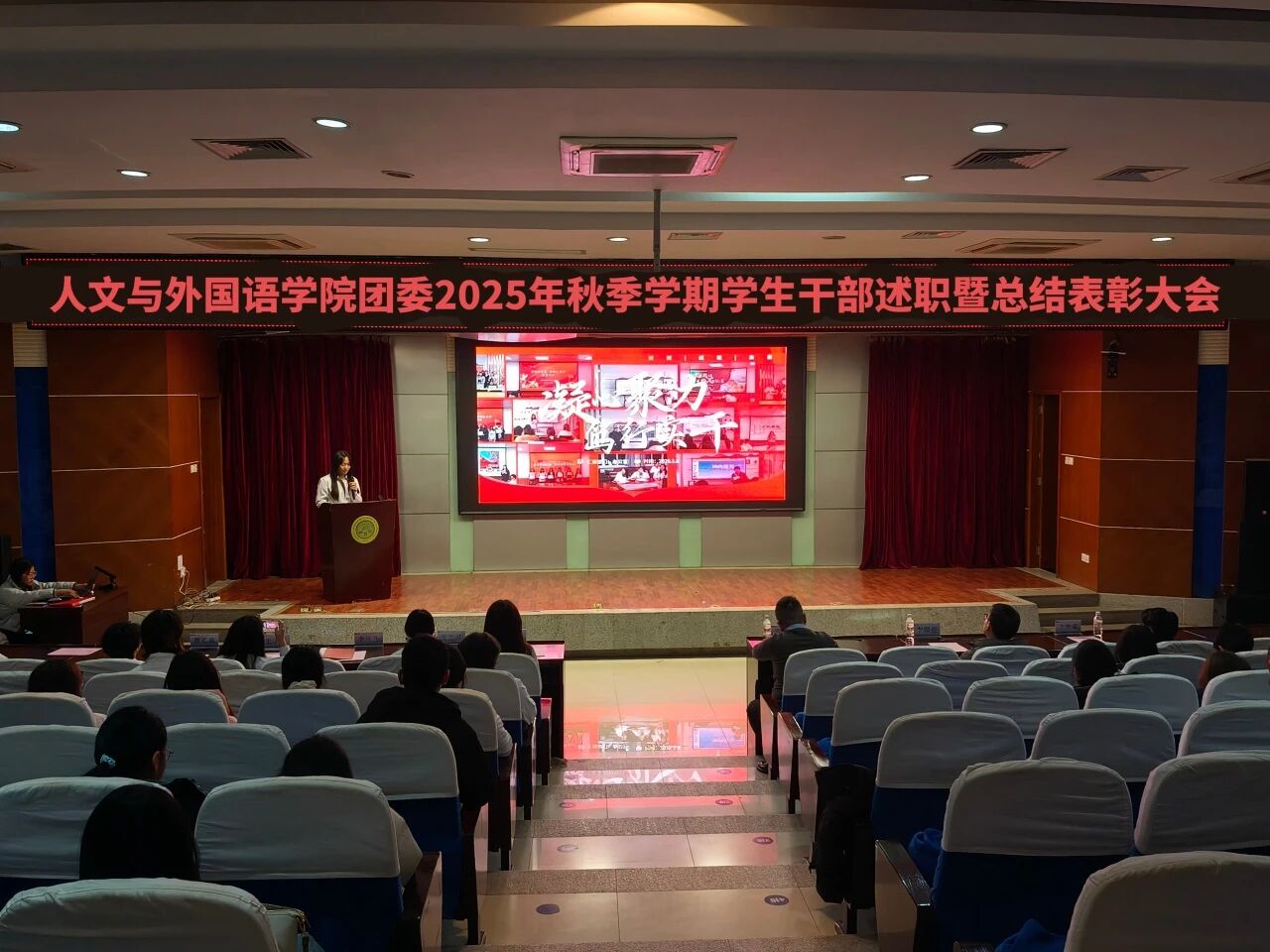 为进一步锚定工作方向,总结工作经验,切实提升学生干部工作能力与水平,1月8日晚,m88APP官网团委在骊山校园图书馆二楼报告厅举办2025年秋季学期学生干部述职暨总结表彰大会,学院团委书记芮智刚,辅导员李银亮、王维蒙,各团支部干部、团委学生会全体学生干部参加了会议,学生会副主席李泳泽主持会议。