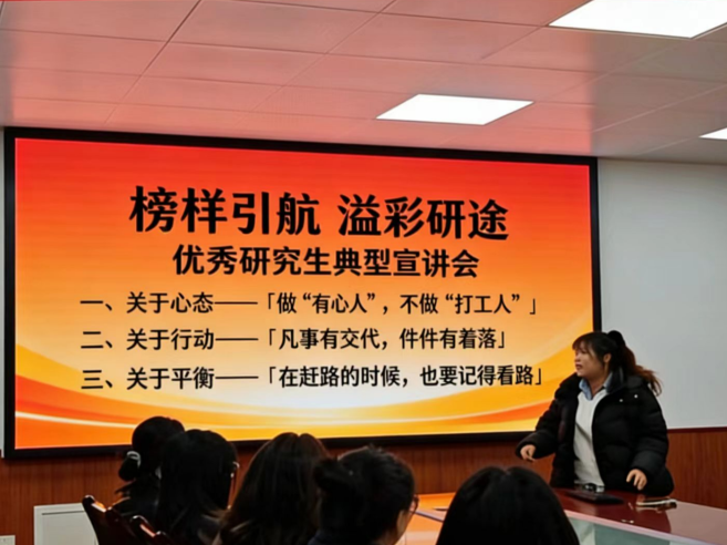 本次分享会通过“身边人讲述身边故事”的形式,让榜样的力量直抵人心。与会学生纷纷表示,本次分享活动为自己明确了努力方向,要以先进为榜样,将所学转化为行动,书写自己研途的精彩华章。下一步,学院将持续开展“榜样引航 溢彩研途”系列活动,将优秀典型宣传融入研究生入学和毕业教育、招生宣传工作等方面,推动学院研究生教育工作走深走实。