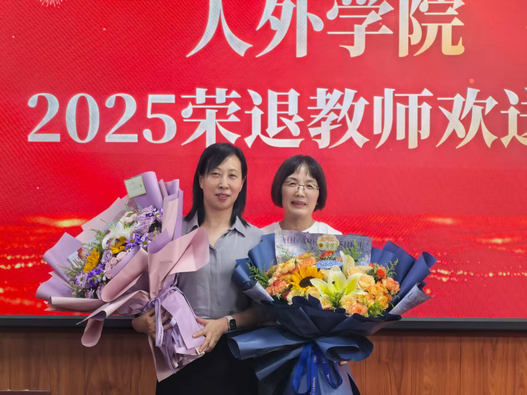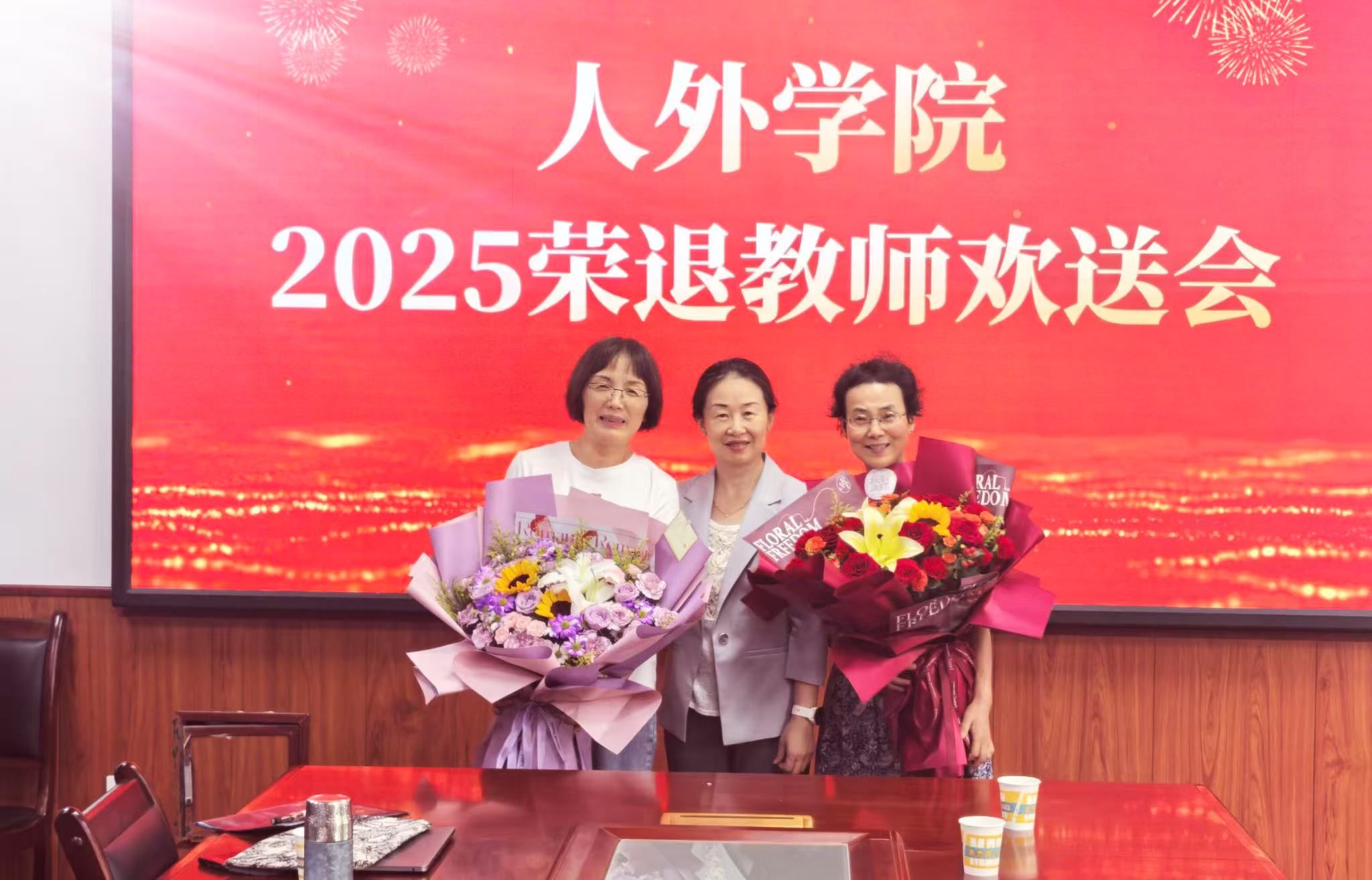 座谈会最后,学院领导为四位退休教授颁发了精心准备的纪念品,并献上鲜花,以表达学院全体师生的感激之情。在场人员共同合影留念,将这一温馨、难忘的时刻定格。此次欢送座谈会不仅让退休教授感受到了学院的关怀与温暖,也进一步增强了全院教师的凝聚力和归属感,为学院营造了尊师重教、团结奋进的良好氛围。